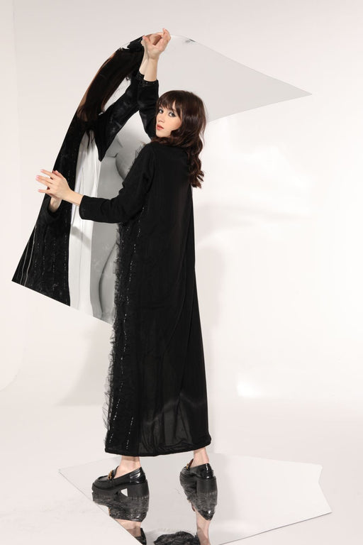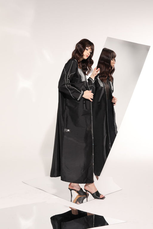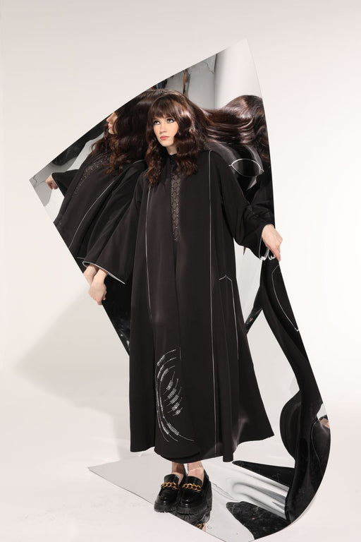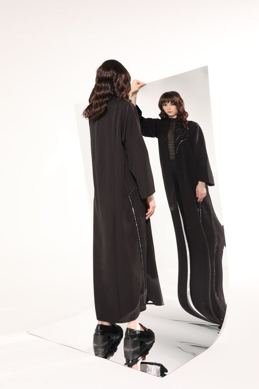 Sequenced Shimmering embroidered black Abaya with contrasting piping details. Elegant and modest piece.