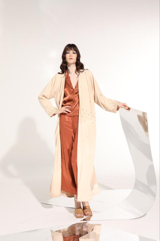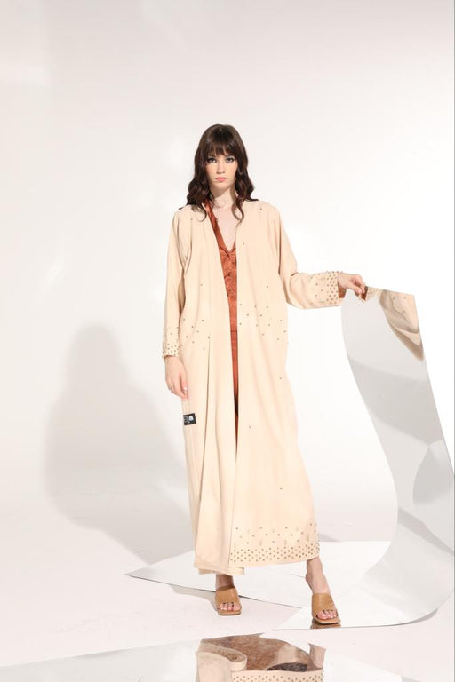 Beige shinny embroidered abaya in soft crepe