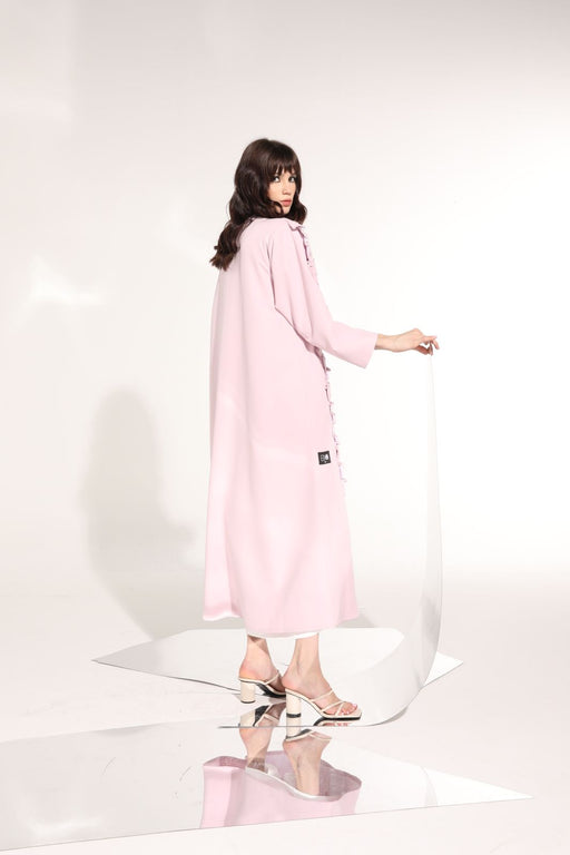 pink abaya with ruffles pearl details
