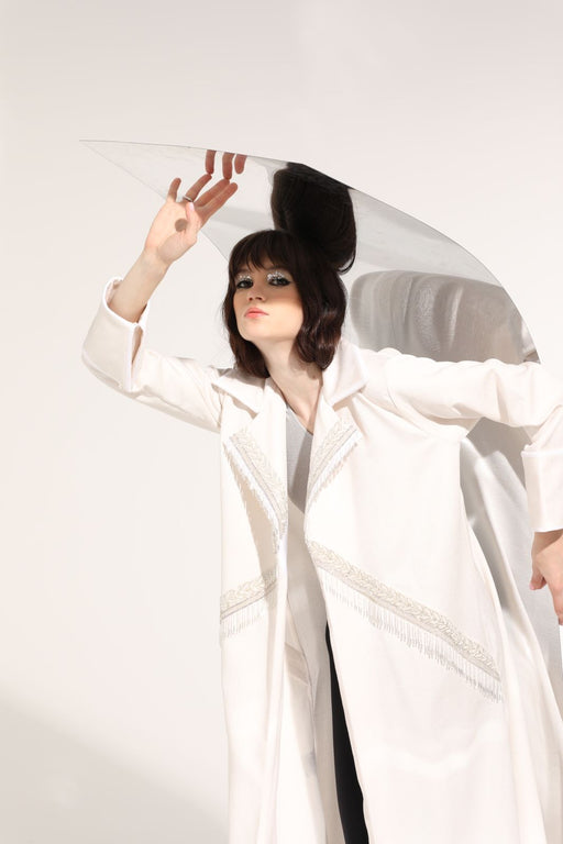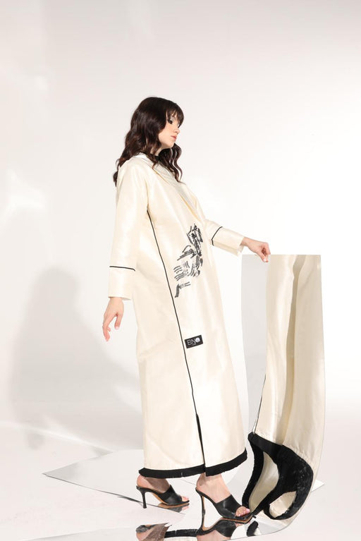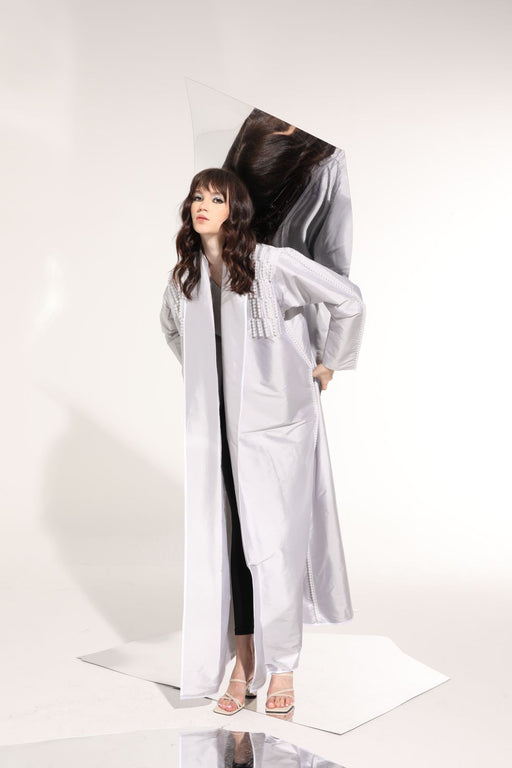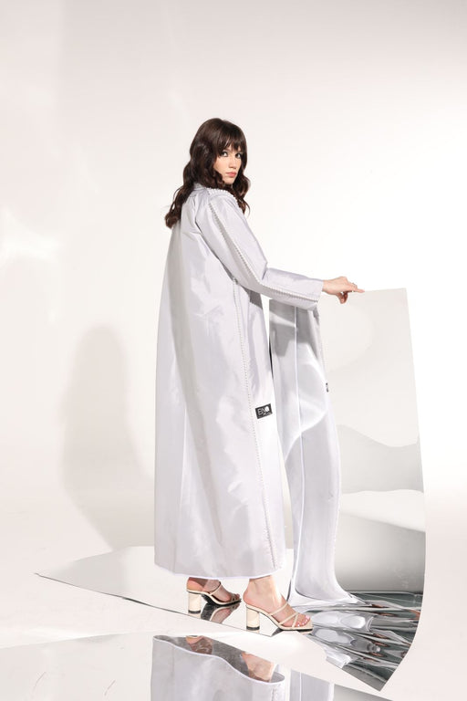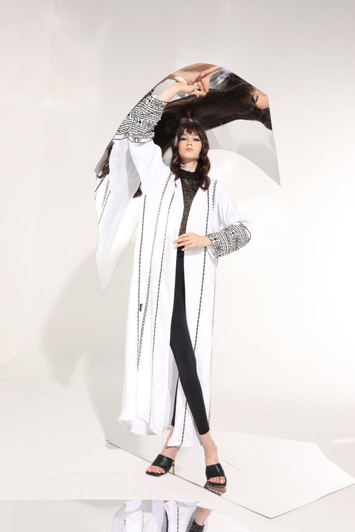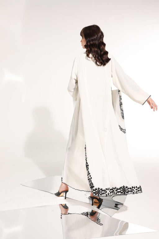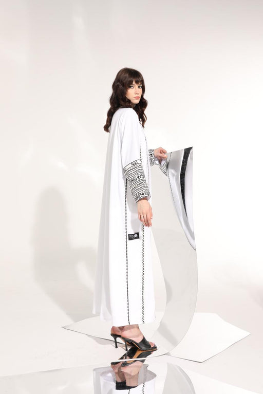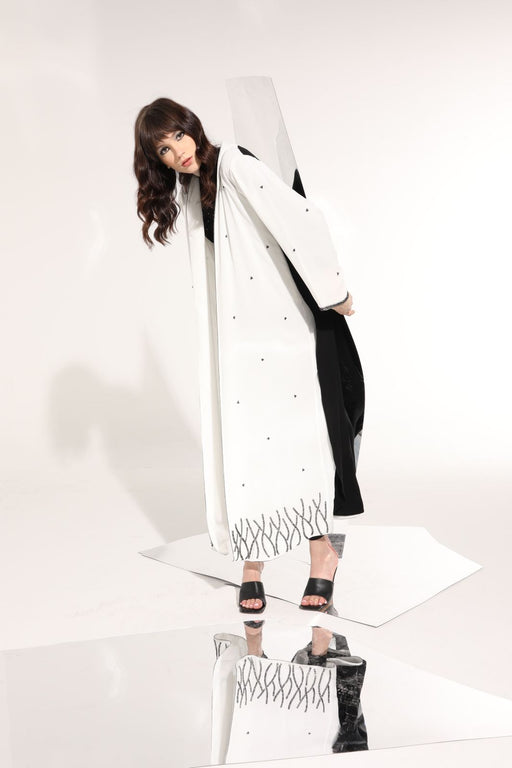 Beautifully detailed white crepe abaya with geometric embroidery and shimmery beading.