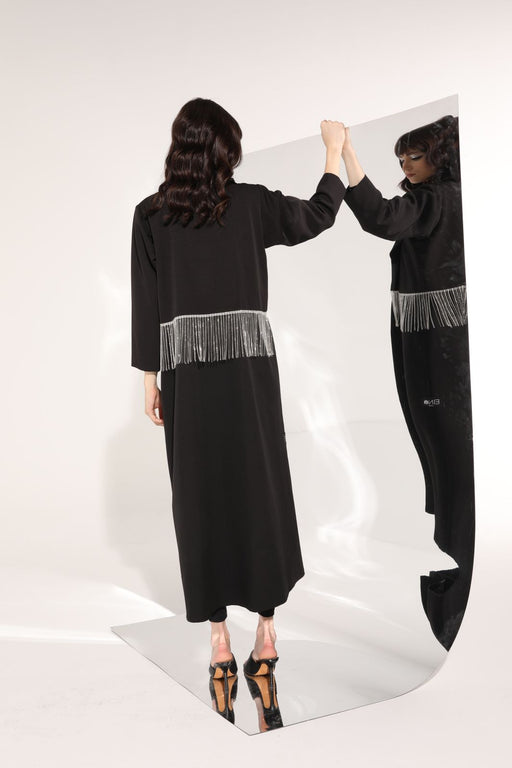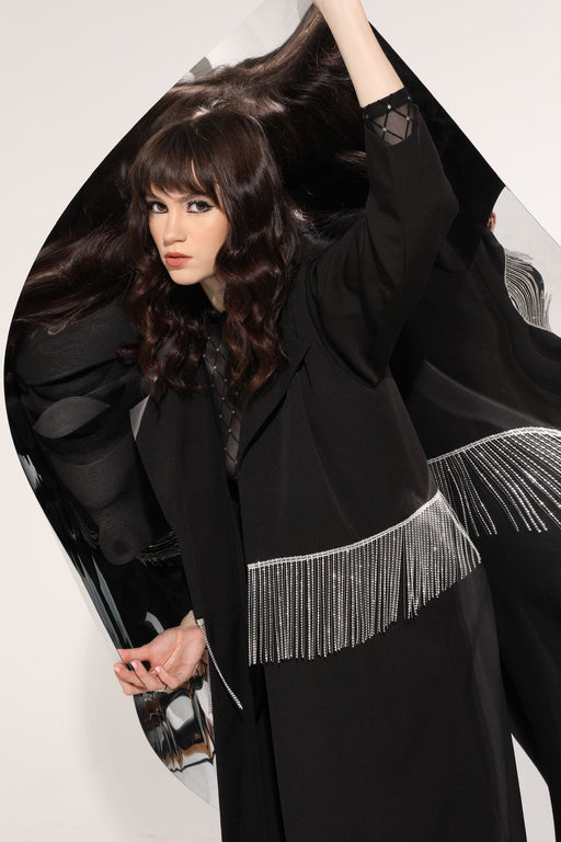Blazer style black Abaya with sparkling crystal fringed trim at the waist