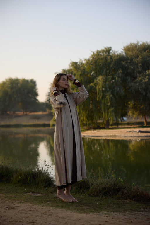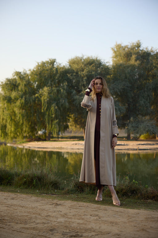 Discover the Subtle Elegance of the Beige Abaya with Mesh Embroidery The Beige Abaya with Mesh Embroidery is a perfect expression of understated lu...