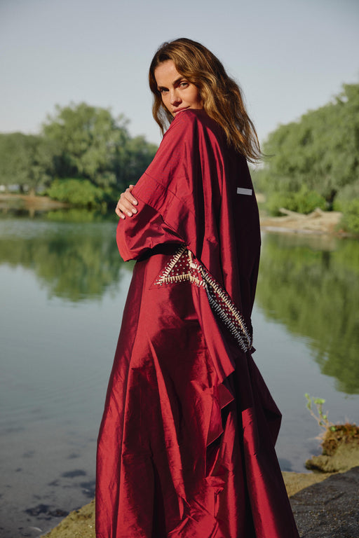 Discover the Luxurious Elegance of the Ruffle Crystal-Embellished Maroon Abaya The Ruffle Crystal-Embellished Maroon Abaya is a striking blend of b...